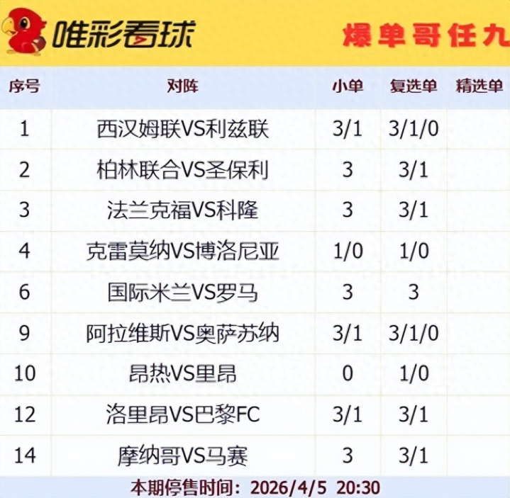 本期任九舍弃了让步较浅、数据模糊的场次,重点锁定足总杯、德甲、意甲、西甲及法甲中基本面清晰的比赛,力求稳健。以下是本期中几场关键比赛的分析与建议:
